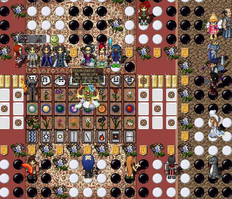 Keeping up the trend of ebbs and flows, all the while hosting an ever-popular mainstay, Destiny Clan dabbled and dabbed with their famous Bingo over in the Omisan Dojo. Dabbing one's card to match items chosen via roll of the dice in the appropriate card landed one with a heavier purse to take home. Game 1 was an X shape, with game 2 an H, and a total blackout required to win game 3. In addition, the ceremonial door prize was selected to correspond with a card number, and a bounty called for the death of one of the winners for an extra couple coins.