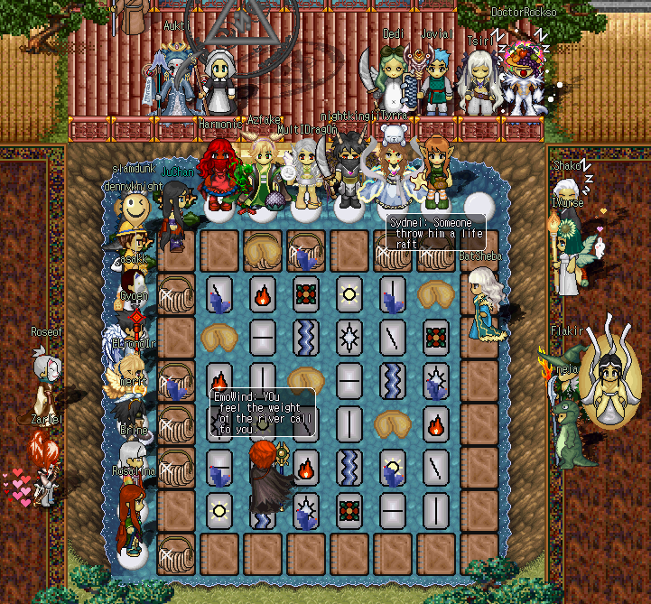 Left: Koguryo Prime Minister Dycean delivers the Haean Festival opening remarks at Dae Shore (Screenshot by Sotae). Center: Sydnei volleys with the Diviner host EmoWind at Fickle Fates held in the Tao te Ching (Screenshot by BatSheba). Right: ELrondJr whiffs a throw versus Brine during Dodgeball held at SunMoon Clan's facilities (Screenshot by Aukti).